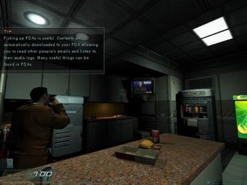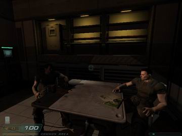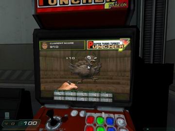 娯楽室隅の旧DOOM風ゲームは実際に操作することができます。スーパーターキーパンンチャースリー♪(音声)