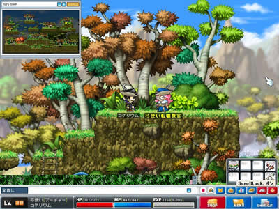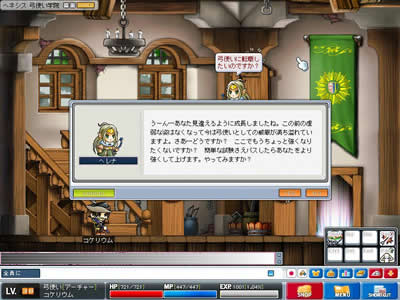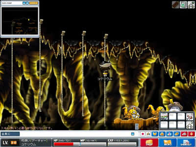 …試験会場の様子。 敵は”エビルアイ”、”ゾンビキノコ”(ともに強化版)の二種類。 …ちょ、おま! 痛ッ!イタタタ!! (゚Д゚ )アラヤダ! ! ・敵の耐久力・攻撃力が馬鹿ッ高い。 ・各ライン毎に戦地が独立している上、敵数が多いため間合いがとれない(押し切られて密着される)。 ・経験値・アイテム・メルを一切取得できない。 ・途中で試験管に話すことで脱出はできるが、その場合は一からまたやり直し。 ・休息・遠距離攻撃できる安置が少なく、ひたすらにガチンコ勝負になる。 (射程が充分に強化してあれば教官付近の足場がつかえそうだけども…) ・どこいらへんが弓使いの試練なのか、問いたい。小一時間問いつめたい。 一言で言えば、時間をかければかけるほどジリ貧。 用いられる全力を持って望み、短期決着を目指したい。 ・初期の”メイプルトラベル”クエストで入手した高価な強化アイテムはここが使いどころ。迷わず投入。 ・スキルもMPが底を着くまで乱用のこと(結果的に出費(HP回復薬)を大幅にを節約できる) ・回復薬はHP・MP用共に余裕を持って臨むこと。不安なら一度ヘネシスまで補充した方がよい。(近いし)