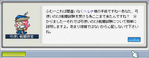 師匠より試験管への手紙を受け取り、ヘネシスからダンジョンへの途上に居る弓使い転職教官を訪ねる。 『弓使いの二次職転職試験について簡単に説明しますよ。 あんまり複雑ではありませんから…。』
