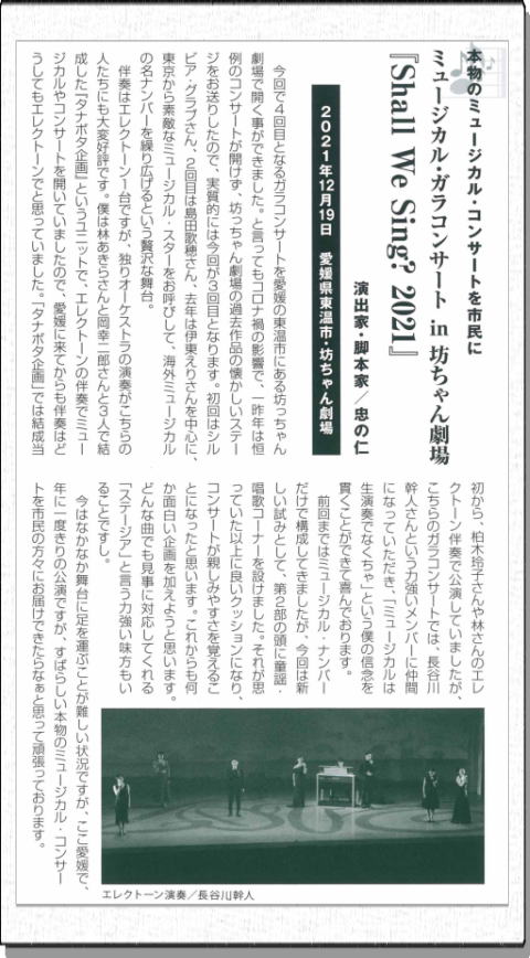 エレクトーンシティが発行しております「Concert News」にて、忠の仁さんのお名前を発見しました! 現在は愛媛にて活動をしていらっしゃる忠の仁さん。ミュージカル・ガラコンサートをエレクトーンの伴奏にて行っており、その際の記事が掲載されております。タナボタ企画のことにも少し触れておりますので、ぜひご一読いただければと思います。