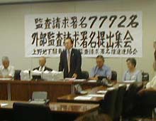 事務監査請求は、(地方自治法 第75条、第252条の39=資料集1)有権者の50分の1(台東区では、9月1日現在で2816名)の署名が必要ですが、「推進連絡会」のよびかけで650名の受任者の方が、お盆休みを返上して署名を訴え、7799名の区民から署名が寄せられました。 |