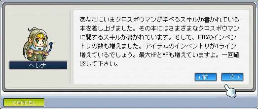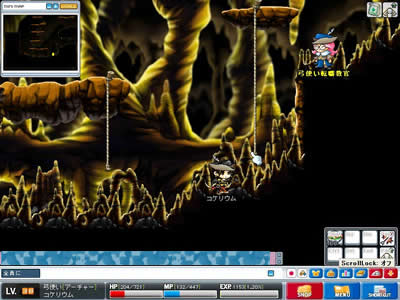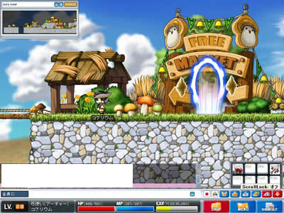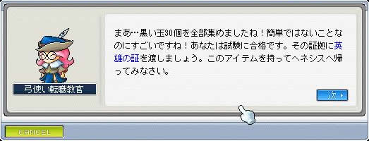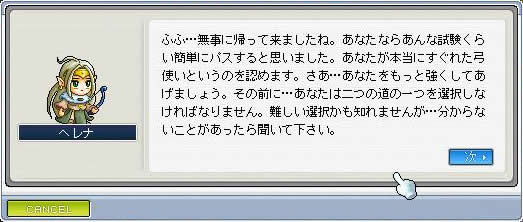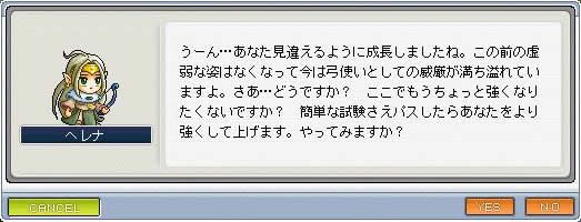 …試験会場の様子。 敵は”エビルアイ”、”ゾンビキノコ”(ともに強化版)の二種類。 …ちょ、おま! 痛ッ!イタタタ!! (゚Д゚ )アラヤダ! ! ・敵の耐久力・攻撃力が馬鹿ッ高い。 ・各ライン毎に戦地が独立している上、敵数が多いため間合いがとれない(押し切られて密着される)。 ・経験値・アイテム・メルを一切取得できない。 ・途中で試験管に話すことで脱出はできるが、その場合は一からまたやり直し。 ・休息・遠距離攻撃できる安置が少なく、ひたすらにガチンコ勝負になる。 (射程が充分に強化してあれば教官付近の足場がつかえそうだけども…) ・どこいらへんが弓使いの試練なのか、問いたい。小一時間問いつめたい。 一言で言えば、時間をかければかけるほどジリ貧。 用いられる全力を持って望み、短期決着を目指したい。 ・初期の”メイプルトラベル”クエストで入手した高価な強化アイテムはここが使いどころ。迷わず投入。 ・スキルもMPが底を着くまで乱用のこと(結果的に出費(HP回復薬)を大幅にを節約できる) ・回復薬はHP・MP用共に余裕を持って臨むこと。不安なら一度ヘネシスまで補充した方がよい。(近いし)